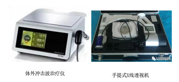科室现有诊疗设备:手提式X线透视机1台;“C”形臂透视机1台;比利时进口“Gymna”体外冲击波治疗仪1台;国产体外冲击波治疗仪1台,双级射频治疗仪1台;微波治疗仪1台;超短波治疗仪3台;ECM99-IC型电脑中频脉冲治疗仪3台;中药熏洗治疗仪2台;颈椎牵引器2台;腰椎多功能牵引床1张;威伐光治疗仪1台,中医定向透药仪2台。