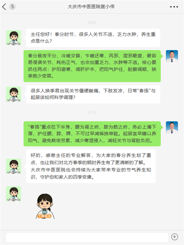 春分是二十四节气之第四个节气。“分”者,半也,这一天昼夜均分、寒暑平衡,标志着阳气渐升、阴气渐降,万物生发、阴阳调和的时节正式到来。北方此时风大干燥、早晚温差悬殊,风邪、湿邪最易侵袭人体,关节不适、乏力水肿、情绪急躁、睡眠变差等问题较为常见,大家在养生上难免有不少疑问。这不,大庆市中医医院的宣小传就带着大家关心的问题,请教了肾病风湿病科主任魏江波,咱们一起来听听专业建议~